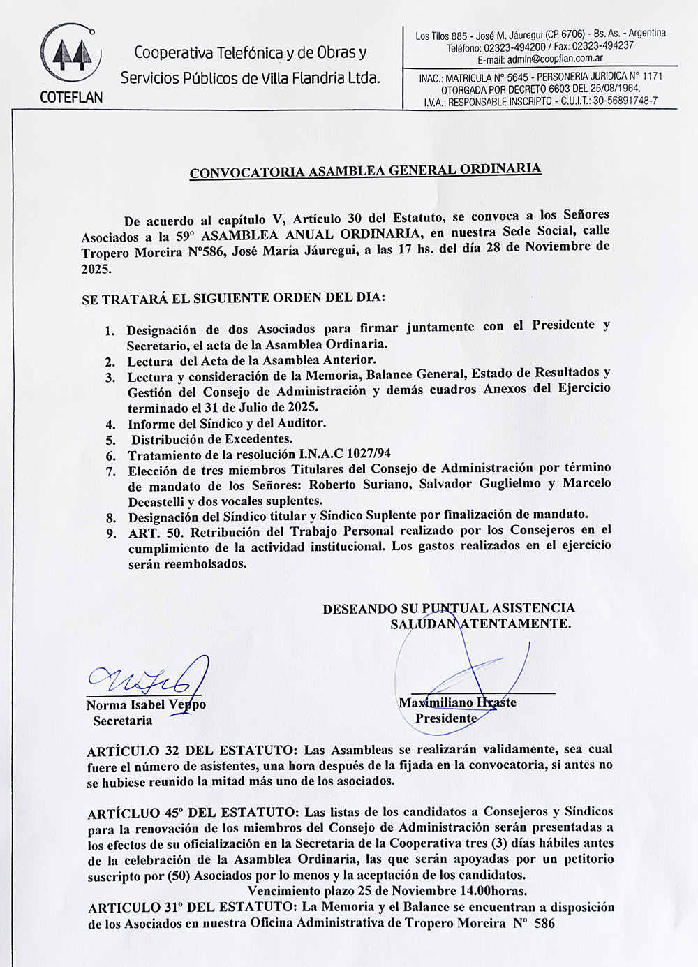 Estimados asociados, informamos que el 28 de Noviembre a las 17 hs. se realizará la 59° Asamblea General Ordinaria. Convocamos a todos los socios a participar de la misma.